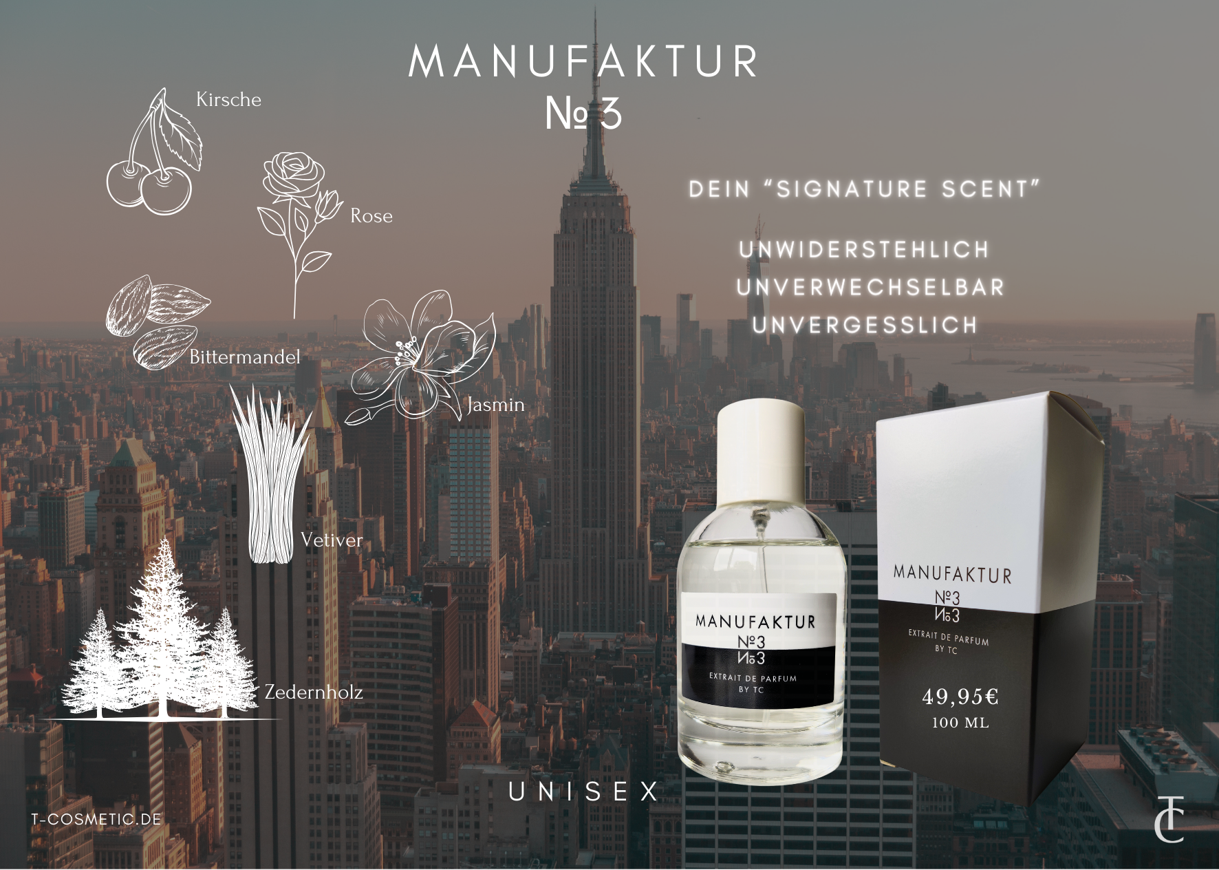 Lassen Sie sich von Manufaktur 3, einem betörenden blumig-holzig-fruchtigen Eau de Parfum, das die Sinne umspielt, verführen. Die romantische Kopfnote aus Rose, Bittermandel und Tonkabohne ist ein vielversprechender Start. Ein fruchtiges Herz aus Kirsche, Rose und Jasmin entfaltet seine volle Pracht. Die warme und erdige Basis aus Sandelholz, Zedernholz und Vetiver verleiht diesem Unisex-Duft eine harmonische Tiefe. Manufaktur 3 ist für alle, die Sinnlichkeit und Eleganz suchen.