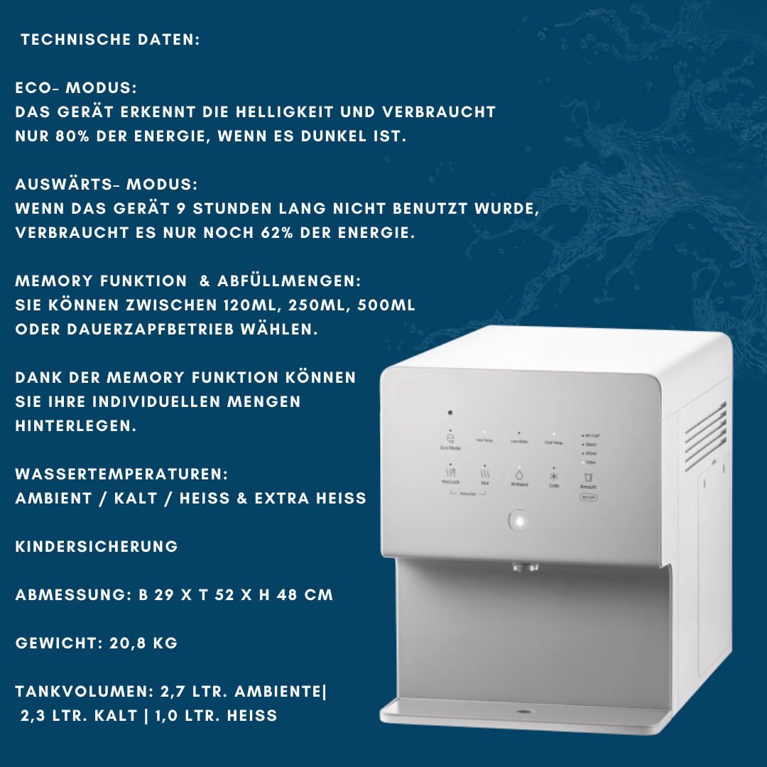 Tankvolumen: 2,7 Ltr. Ambiente |2,3 Ltr. Kalt | 1 Ltr. heiß
